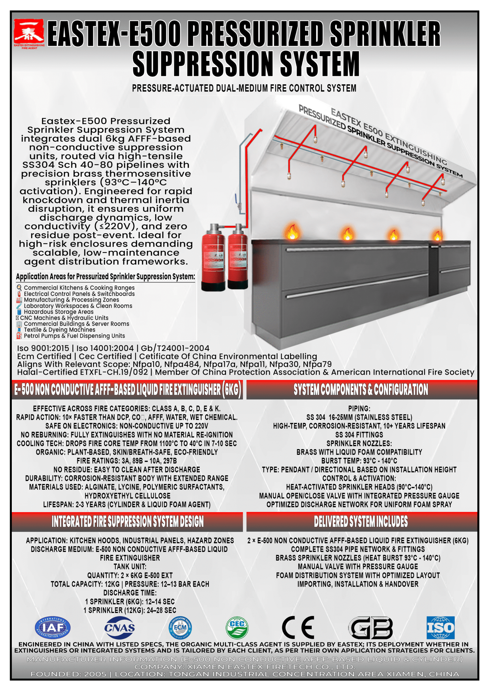 The EASTEX E500 Kitchen Hood Suppression System is a state-of-the-art fire protection solution. It is specially designed for high-risk environments like kitchen hoods, industrial control panels, and hazardous zones. Developed by Xiamen Eastex Firetech Co., Ltd., the system features the E-500 Non-Conductive AFFF-based Liquid Fire Extinguisher. This ensures fast, safe, and environmentally friendly fire suppression.
