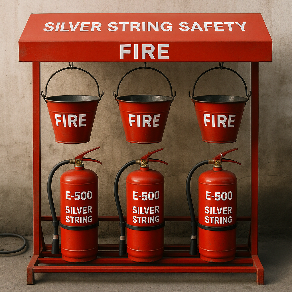 The Extinguisher & Buckets Outdoor Shed Stand from SILVER STRING SAFETY offers a complete fire safety setup for high-risk, outdoor, and industrial locations. Designed for immediate fire response, this dual-tier stand holds three galvanized fire buckets on the top and three fire extinguishers (5–6 kg) on the bottom.