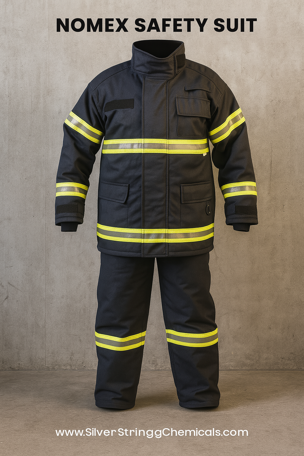 This suit is made from Nomex, a high-performance, flame-resistant meta-aramid material. It offers superior heat protection while maintaining durability. Nomex does not melt, drip, or support combustion, making it an ideal choice for professional and volunteer firefighters.